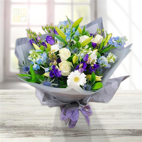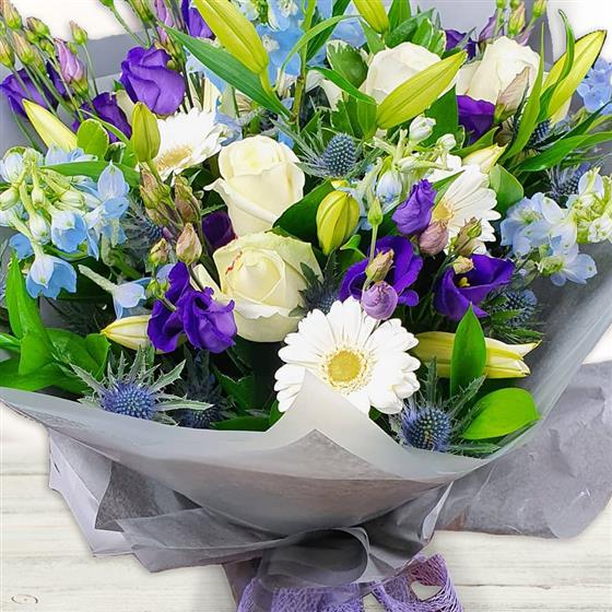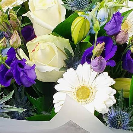A gentle mixed flower bouquet featuring cream roses, white gerberas, blue delphinium, purple lisianthus, closed lily buds and textured thistle, arranged with fresh green foliage for a calm, elegant finish.
