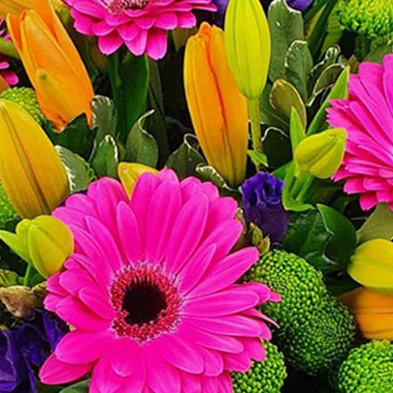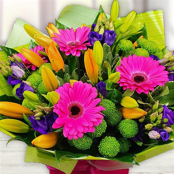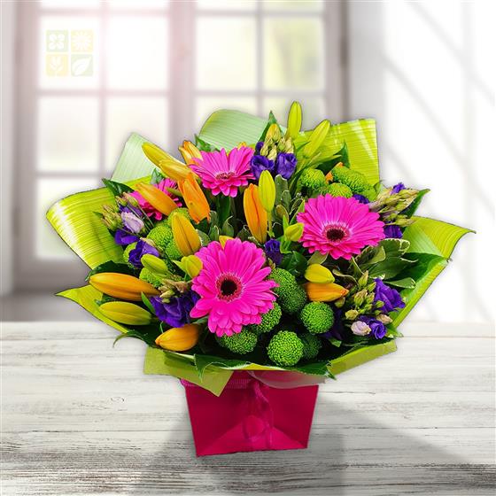 Cheerful gerberas, lilies, lisianthus and button chrysanthemums in bold pink, orange, purple and green hues, wrapped in bright paper for a tender burst of joy.