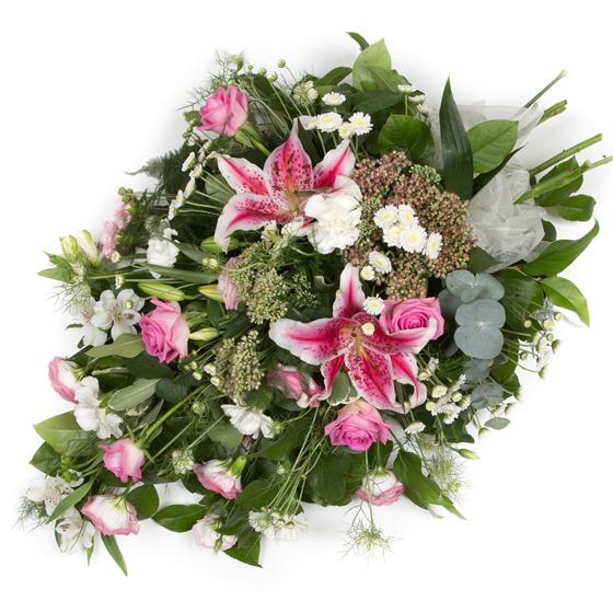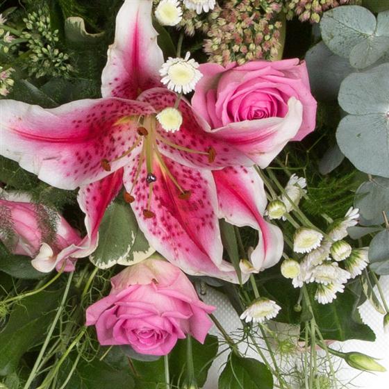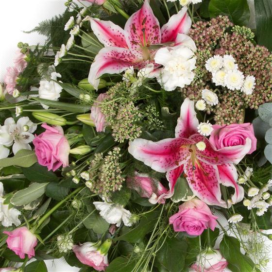 A pretty and feminine spray of pink and cream blooms including stargazer lilies, lisianthus and alstromeria with delicate nigella.