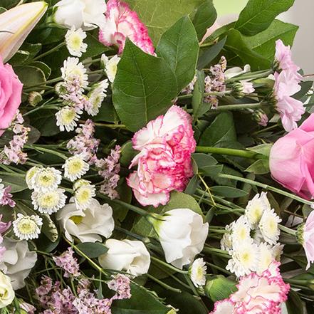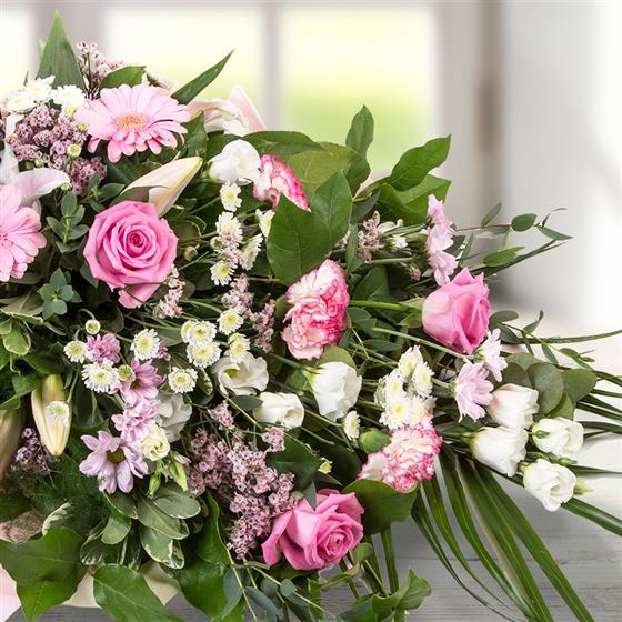 A traditional style bouquet in shades of pink and cream, including roses, chrysanthemums, lisianthus & limonium.