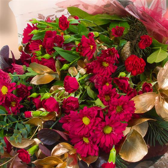 A lovely mix of deep, rich reds blooms and seasonal foliage. This traditional style bouquet is simply wrapped to enable the recipient to arrange their gift as they wish.