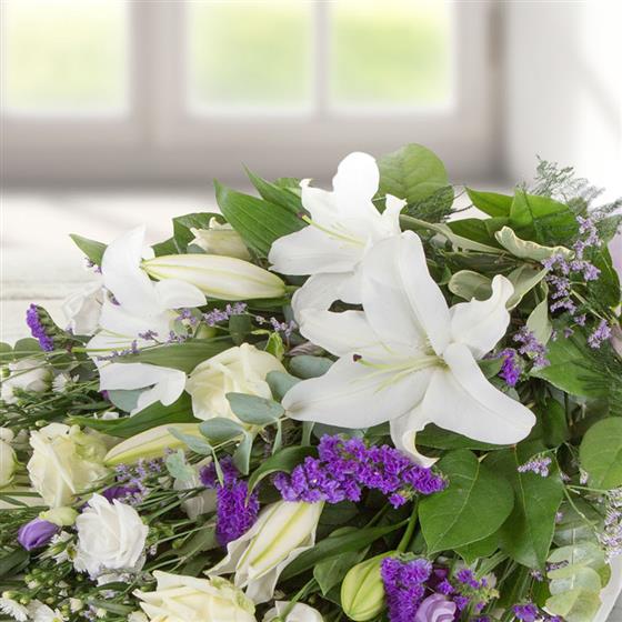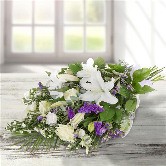 Whites and purples simply combined to create a classic traditional bouquet, including lilies, iris, september flower and limonium.